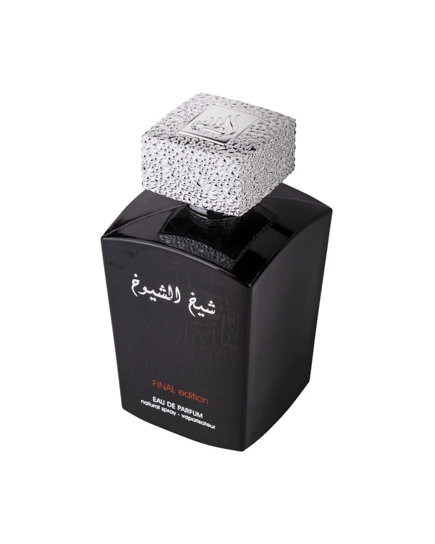 Discover Lattafa's Sheikh Al Shuyukh Final Edition Eau de Parfum, a 100ml men's fragrance blending lemongrass, lemon, sage, lavender, leather, cardamom, rose, rosemary, mimosa, cedar, musk, amber, vanilla, and oakmoss for a fresh, floral, woody, and leather scent.